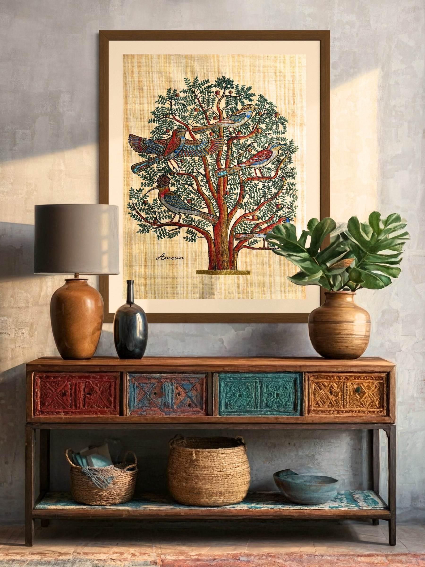 Nos papyrus sont réalisés à la main sur de véritables feuilles, ornés de motifs vibrants et de touches dorées, apportant une touche d’élégance et d’authenticité à votre intérieur.