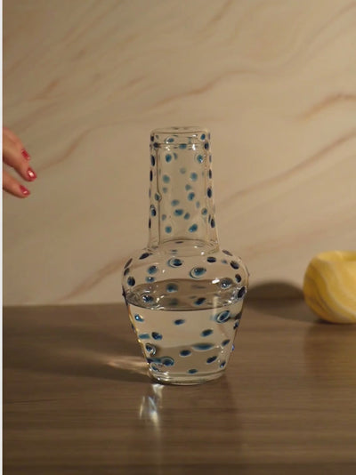La surface extérieure de la carafe est ponctuée de points en relief, appliqués à chaud, d’un bleu profond, comme des gouttes d’eau. Le toucher devient sensoriel, le regard s’attarde.